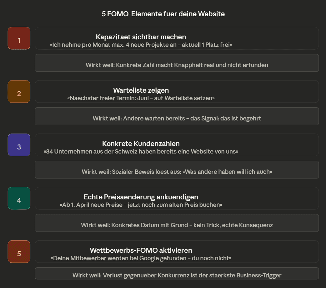 Jetzt wird es praktisch. Hier sind die fünf wirkungsvollsten FOMO-Elemente – alle ehrlich, alle umsetzbar.